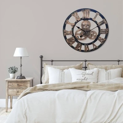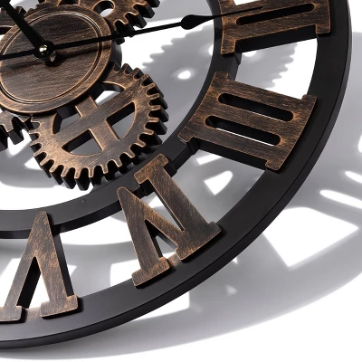 This classic timepiece is the perfect clock to make a statement with the large industrial gears, This Westclox 20” classic Roman numeral wall clock features large Roman numerals that are easy to read from anywhere in the room. The open dial design allows you to see through the gears and numbers exposing the wall behind. Classic black finish with hand painted gold edges. Quality quartz movement ensures perfect time accuracy. Requires one AA battery to operate. One Year Limited Warranty.