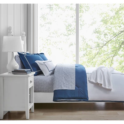 Scout is introducing a comforter bonus set that will help making your bed each morning a simple task. Included in each set is a comforter, 2 shams, (1 for twin size) and a coordinating pillow cover to pair. featuring a crisp white ground, this comforter is designed with a hotel inspiration in mind. The top of bed is outlined in a classic Scout blue that is also brought into the shams and comforter reverse. The decorative pillow cover is also designed to mimic the top of bed in a smaller scale. Made of 100% cotton, the components in the set are made for durability and long lasting use. The comforter is medium weight with an 8 oz. Fill weight made of 100% polyester for a lofty set. All sets are easy to care for as they are machine washable.