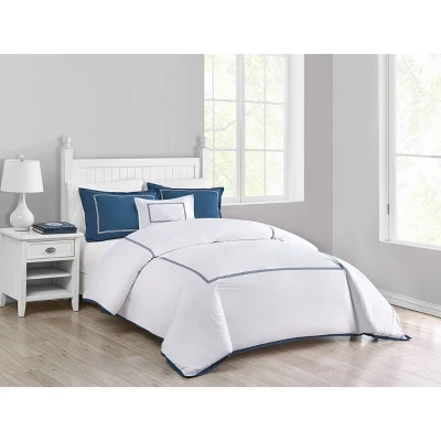 - Walk The Line Features A Hotel Inspired Comforter Set That Blue Borders The Outline Of The Bedding On Crisp White Ground The Reverse Is A Classic Blue That Comes Through On The Flange Of The Bedding For A Pop Of Color Accenting The Framed Top Of Bed The Shams In The Set Are A Fun Play On The Comforter As They Were Designed With The Blue Ground And White Outline To Coordinate In A Playful Way The Included Decorative Pillow Cover Mimics The Top Of The Comforter In A Smaller Scale Blue Border On A White Ground