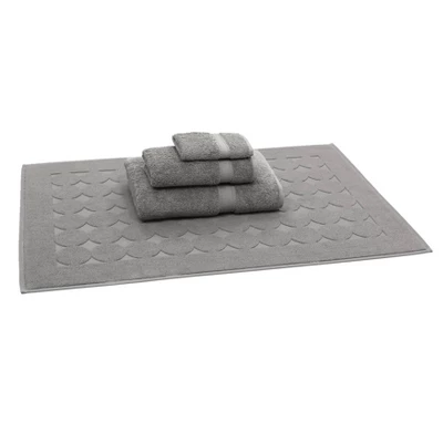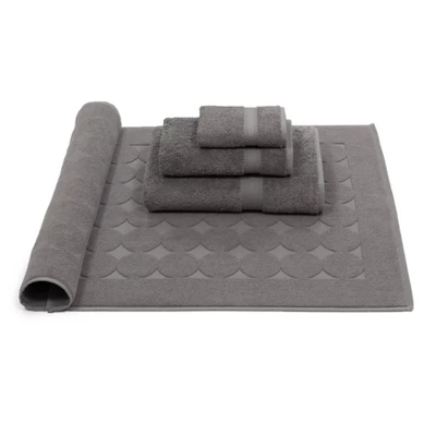 This 4-piece set includes 1 bath towel (27″ x 54″), 1 hand towel (16” x 30”), 1 washcloth (13” x 13”), 1 Circle Design Bath Mat (24″ x 35″)