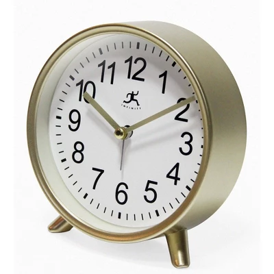 frame. The Gold Tabletop Alarm Clock also features gold metal hands and easy-to-read Arabic numerals