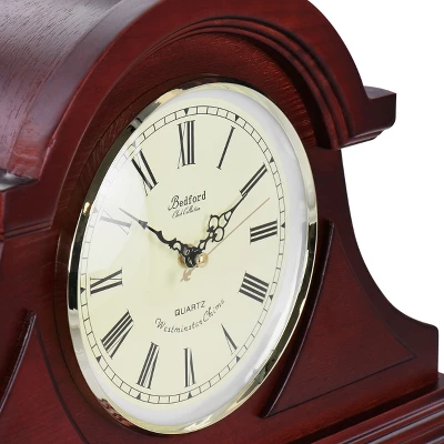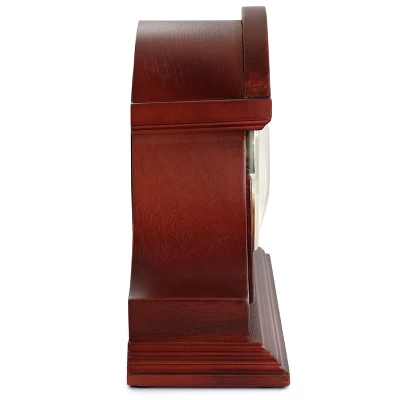 This exquisite Mantel clock features a Redwood oak finish case. Rich and deeply colored it is timeless and exquisite. The dial is bright and perfectly brings forward the roman numerals for your ease. This classic Mantel clock is a stunning addition to any room, whether it is above a fireplace or on a desk. Has 4 chime settings and volume control.