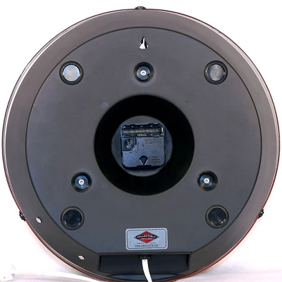 The clock measures 14 inches across. The outer lens is made from high quality optical lexan held in place with 3 removable rivets. It’s scratch resistant and won’t yellow over time. The advertisement face is cut out by a CNC router and the image is placed with a UV dried computer controlled printing process that will last for many years. The back of the clock is made from black ABS plastic that houses an LED light source with an on/off switch in the cord. The clock is a battery operated quartz movement that runs from 1 double AA battery(not included). This sign is awesome when lit!