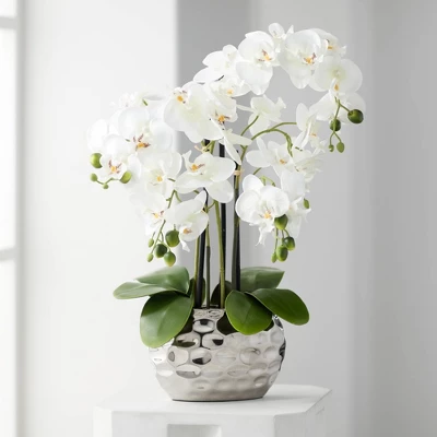 Bring the beauty of flowers to your home with this exceptional faux white phalaenopsis orchid. The contemporary silver resin pot features fabulous texturing to add to the rich character of this floral accent piece.