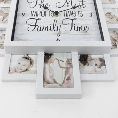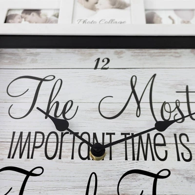 This unique timepiece brings your memories and family to the forefront. This lovely collage clock features multiple frames around a central quote that reads, “the most important time is family time”.