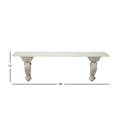 Display your coveted wares with soft vintage style on this white floating wall shelf, boasting decorative scrollwork along its soft beige edges. The long, flat rectangular shelf surface securely displays your photos and Knick knacks while the rolling base adds antique flair and dimension to your wall. The neutral soft white and beige tones work with any color palette, and the decorative chipped finish adds extra character. This item comes shipped in one carton. Easy to hang by keyhole hardware. Suitable for indoor use only. Holds up to 20 lbs. Farmhouse-themed style.