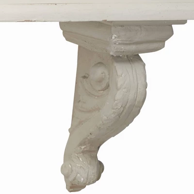 - This white wall shelf features carved wood panel with carved scrollwork brackets
