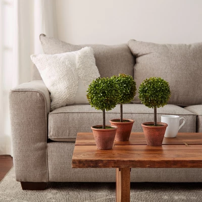 Enjoy beautiful greenery all year long with the 3-Piece Faux Boxwood Topiary by Pure Garden. These artificial plants are great for busy folks who want a bit of color and greenery in their home, but don’t have time to care for living plants. The plants are made of polyethylene plastic to appear more lifelike than other artificial greenery. The pots are made of a durable paper pulp with a terra cotta-color finish for rustic charm. Each plant and pot is generously sized to add beauty to any room in your home and they make ideal gifts for housewarming parties, weddings or holidays.