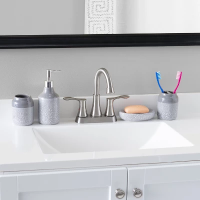 Capture a vintage vibe to your bath with the help of the Crackle 4 Piece Bath Ensemble. The crackled detailing gives this set rustic aesthetics, while the cool grey color offers a contemporary twist. Great if youāre looking for bath accessory set that brings aura of nostalgia, but offers modern day function keep one for yourself or present it to friends and family for the perfect housewarming and wedding gift. The set comes complete with a lotion dispenser, soap dish, tooth brush holder, and tumbler. Accessorize this set by placing each piece on one of our wide selection of bathroom vanity trays to keep your bathroom essentials beautifully displayed and organized during the morning rush. For easy maintenance, simply gently wash the set with mild soap and water.