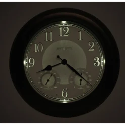 - Indoor and Outdoor Use: Within this outdoor wall clock, the metal, oil-rubbed with bronze evokes hints of the past as it encircles an off-white dial bearing silver Arabic numerals boldly outlined with black. The black hour and minute hands complement the clock. The clock’s light sensor detects darkness, upon which the four LED lights brighten the dial for easy visibility. It then dims in the daylight.