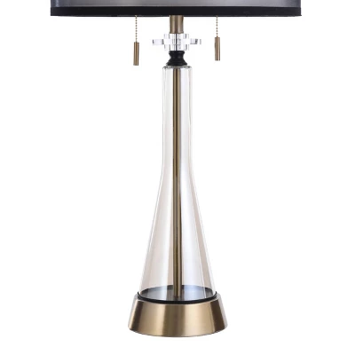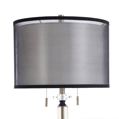 Brilliant contrasts throughout this elegant lamp make it a striking piece for any modern room. The body features dueling materials, with amber-colored glass surrounding a brushed steel rod that travels between the base and the bulb. Above, the shade consists of an outer layer of transparent black fabric surrounding a secondary drum made of white linen. Due to lighting and monitor differences, actual colors and finishes may vary slightly from what appears online