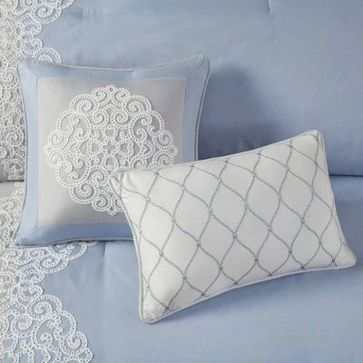 - White floral embroidery detail on comforter, shams and decorative pillow