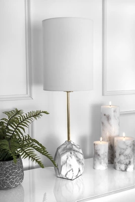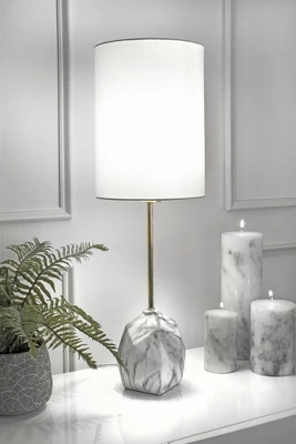 A 27-inch ceramic linen table lamp with a contemporary design. It has a 9-inch wide, ivory, cotton, drum lampshade that delivers soft lighting. The base is a white marble with a stainless-steel pipe as its neck.