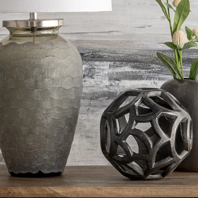 This fun and unique table lamp features a classic base made of glass. The body is finished with a textured accent that complements the soft curves featured in the design. A table lamp this daring is promised to make the coziest nook and provide ample lighting for your space. A rug pad is recommended to prevent slipping.