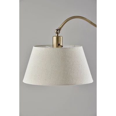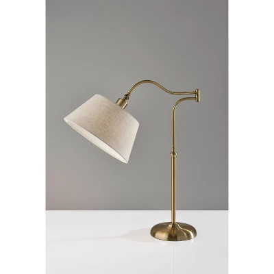 With a touch of urban edge, the Rodeo table lamp modernizes the traditional bridge lamp, giving it an adjustable swing arm in addition to a curved silhouette. The swing arm rotates horizontally, while the shade can be adjusted vertically and secured with a locking key joint, allowing you to direct the light wherever it’s needed. A textured cream colored drum shade brightens the design, softly distilling the light from a 60W bulb, while the antique brass finish adds mid-century modern flair. Complete your décor with the coordinating Rodeo floor lamp.