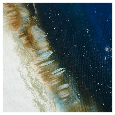 Rolling Waves is a triptych set that features a cool and tranquil abstract piece by Blakely Bering. The three piece set incorporates a deep and rich navy, crisp white, and hints of gold to give it added style. The art is printed on canvas and lightly gel coated for texture.