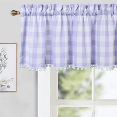 Upgrade your kitchen or bathroom windows with our Buffalo Check Plaid Pom Pom Valance Curtains. Each package includes 1 panel measuring 52W x 15L inches, with a 2-inch rod pocket for easy hanging. The classic buffalo plaid gingham checkered pattern, along with the charming pom pom trim, adds a stylish touch that works well with modern farmhouse, French country, rustic/country, and Christmas decorations. Made with 100% yarn-dyed spun polyester, these curtains are wrinkle-resistant, lint-resistant, and snag-resistant, ensuring long-lasting quality. They allow natural light in while providing privacy, making them perfect for kitchens, cafes, bathrooms, and more. Machine washable for easy care. Elevate your space with these stylish Buffalo Check Pom Pom Valance Curtains.