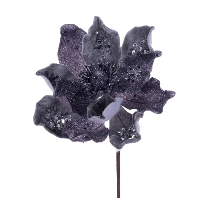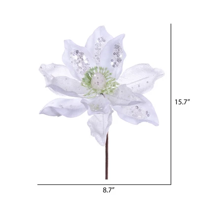Vickerman 15″ Deluxe Magnolia Stem. The stem measures 15 inches from top to bottom. The flower measures 8 inches wide. It includes 6 flowers per bag and features a wired stem.
