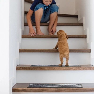 Enrich your stairs with these stunning, yet practical and decorative stair treads. The distressed abstract design adds interest and style to every step. The rubber backing provides additional safety for climbing kids and pets. At 26 inches x 8.6 inches, these machine washable treads are ideally sized for the majority of staircases.
