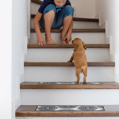 Enrich your stairs with these stunning, yet practical and decorative, stair treads. The floral circle design add interest and style to every step. The rubber backing provides additional safety for climbing kids and pets. At 26 inches x 8.6 inches, these machine washable treads are ideally sized for the majority of stairs.